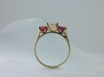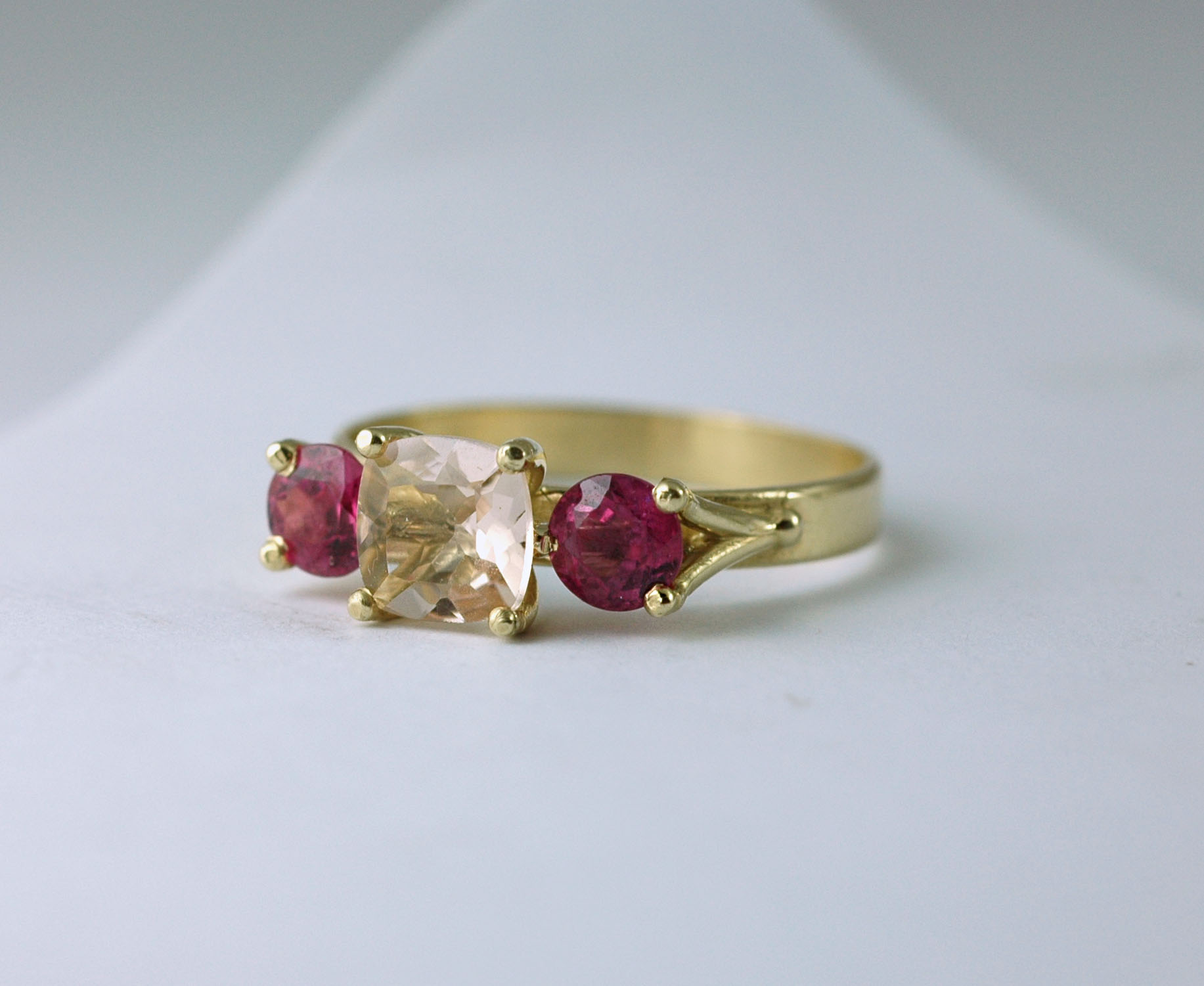 טבעת זהב 14 קראט משובצת אבן מורגנייט בצורת קושן ושני ספירים של 20 נקודות כל אחד.