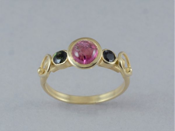 טבעת זהב משובצת טורמלין ורוד קבושון וטורמלין ירוק בקבוק