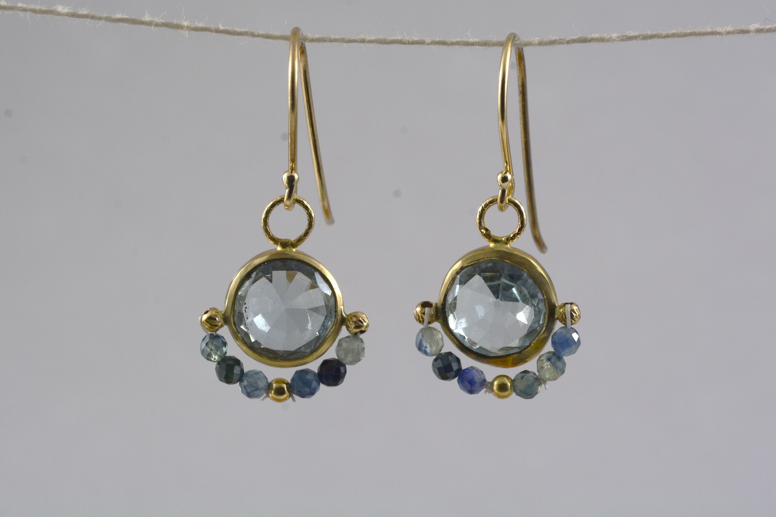 עגילי זהב 14 קראט משובצים אקוומרין עם מחרוזות ספירים