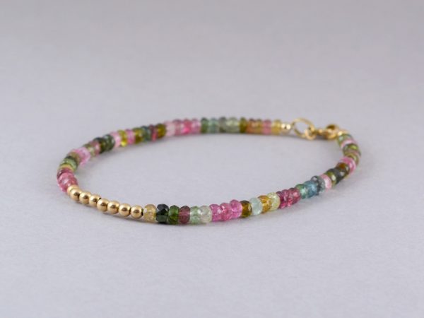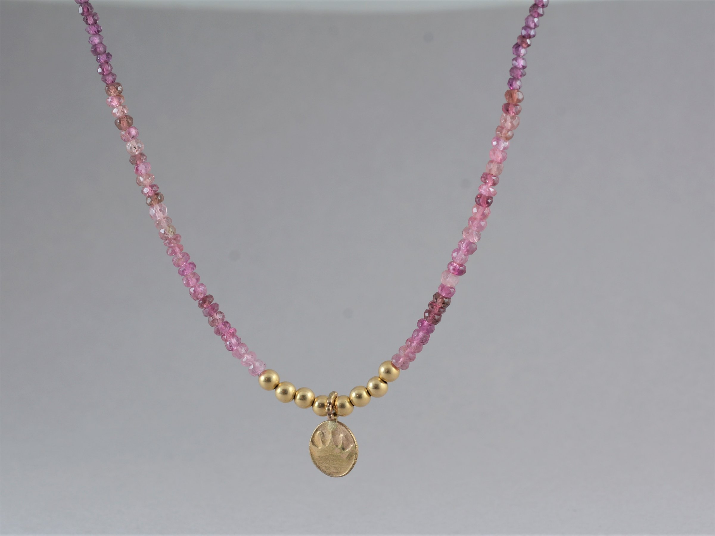 תליון אבני טורמלין ורודות עם תליון זהב עגול וחרוזי זהב 14 קראט